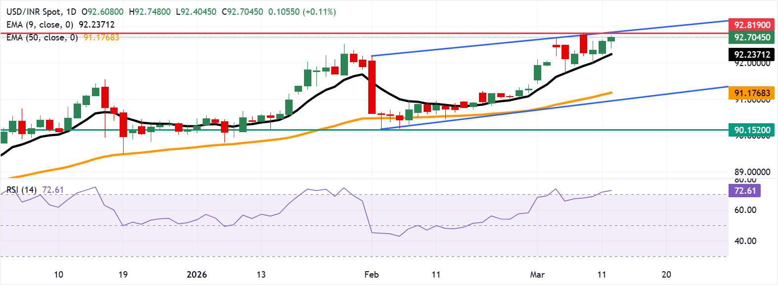 The USD/INR pair targets the all-time high of 92.81, reached on March 9, followed by the ascending channel’s upper boundary at 92.90. On the downside, primary support lies at the nine-day EMA at 92.23. A break below this level would weaken the short-term momentum and expose the 50-day EMA at 91.17, followed by the channel’s lower boundary near 90.90.